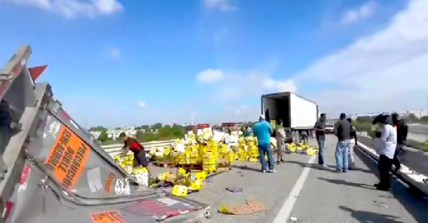 Los hechos se registraron sobre la carretera que conduce al puente internacional Reynosa-Pharr, a un costado del parque Industrial Colonial, donde un tráiler con remolque cargado de aguacates se volcara.