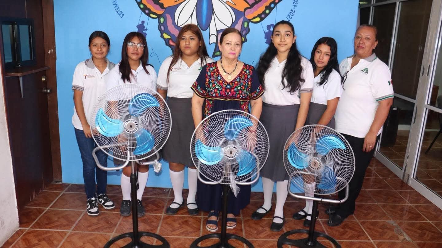 Río Bravo, Tamaulipas.-La Sra. Blanca Arizpe de Almaraz realizó la entrega de ventiladores a la Escuela Telebachillerato 021 del ejido Río Bravo, como parte de su compromiso con el apoyo a la educación y la mejora de la infraestructura escolar.