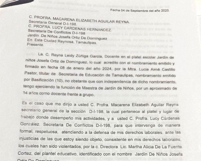 Leidy Zúñiga García, señala que a través de un oficio dirigido a la Secretaria General Delegacional D-1-198, a la profesora Macarena Elizabeth Aguilar Reyna, y a la profesora Lucy Cárdenas Hernández, de conflictos de esa misma delegación sindical, donde le expone la problemática haciendo llegar con copia a las autoridades de la Secretaria de Educación de Tamaulipas, y a la Directora de ese plantel educativo en la que solicita la intervención sindical para que haga su defensa a sus derechos laborales.