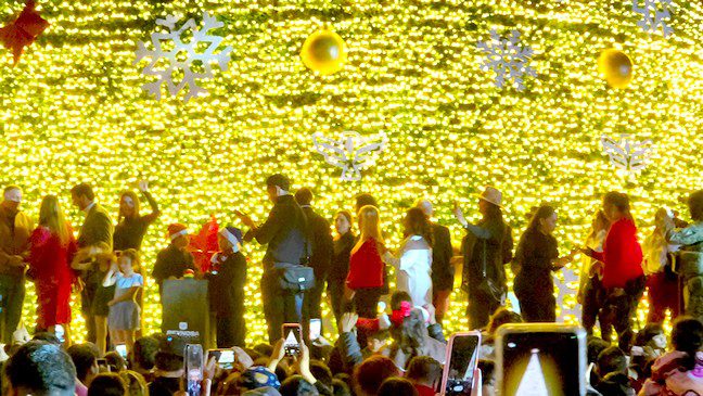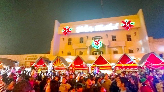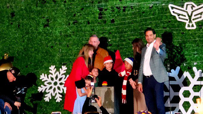 Reynosa Tamaulipas.-Totalmente abarrotada se vio la plaza principal Miguel Hidalgo, donde el alcalde Carlos Víctor Peña Ortiz, encendió el mega pino de la navidad, y dio la apertura de la eco-pista de patinaje con motivo del festival navideño 2025.