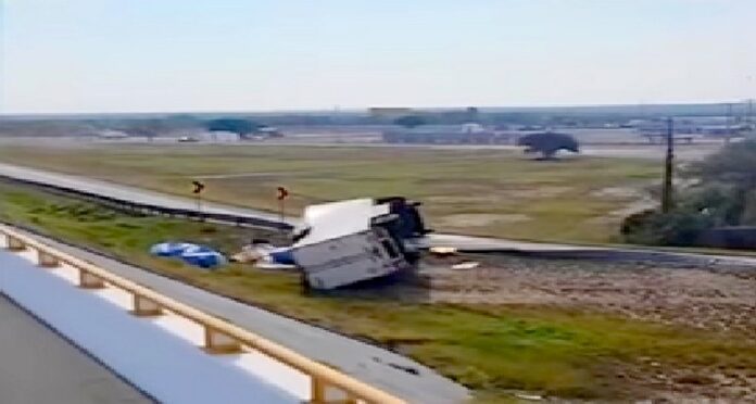 Reynosa, Tamaulipas.-Aparatoso accidente vial se registro en una apartada carretera hacia el oriente de la ciudad, donde un tráiler terminara volcado, dejando daños materiales, y obstrucción vehicular.