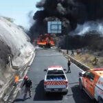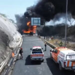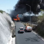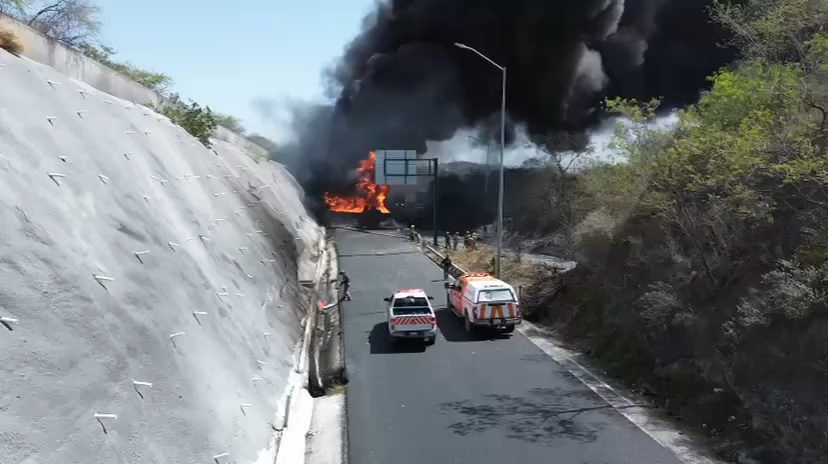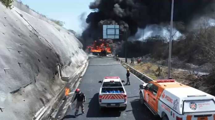 La vialidad permanece cerrada mientras una densa columna de humo se eleva en la zona. Elementos de Protección Civil y bomberos trabajan en el lugar para controlar la emergencia.